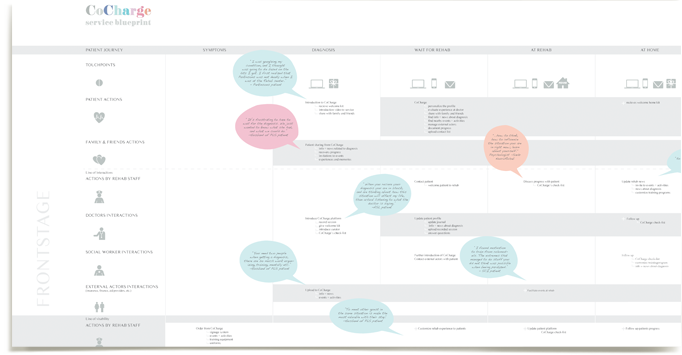 In CoCharge's service blueprint we show how the service is introduced to the patient from the moment of the diagnosis; how it accompanies him/her before, during and after rehab; and how it includes family and friends to the recovery experience.
