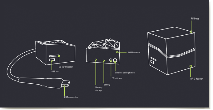 The static dock stays at home, and digital natives use it to download their pictures and see them in the desktop application. The portable token they bring back and forth between home and school. They use it to learn and access their data at school, and to discover connections with their classmates.